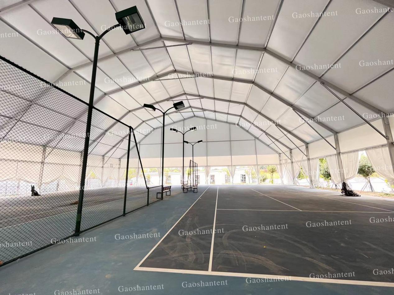 多拱型篷房除了造型新奇外,與人字篷房相比,其頂高能做到更高,內部空間擴大,更適用于網球等球類運動場景。網球館四周篷布可以拉開通風也可以無縫圍起遮風擋雨。