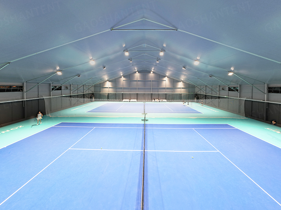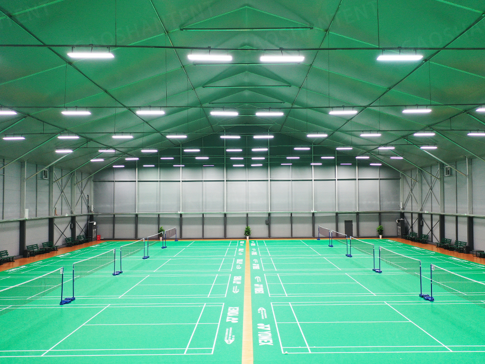 該篷房采用高強度鋁合金主體框架和PVC涂層篷布,具備優異的抗風性能,可抵御12級大風。篷房內部無任何支柱,創造了寬敞舒適的運動環境。篷布添加專用防腐蝕劑,有效防雨防潮,解決了雨季腐蝕生銹的困擾