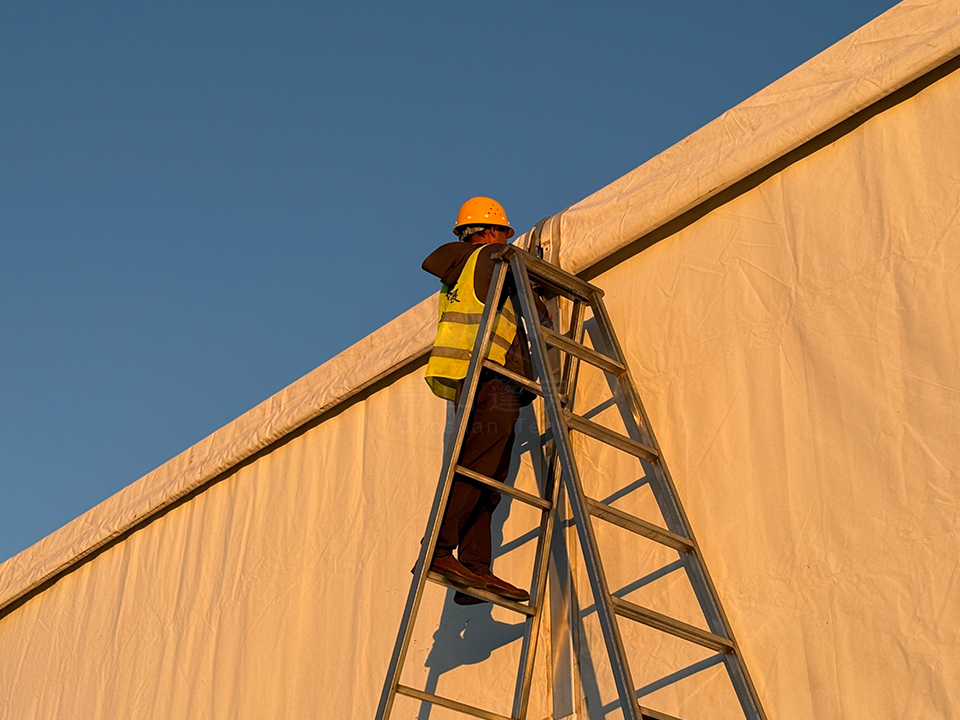 工人們的身影在光影里忙碌著,汗水混著霞光,每一寸搭建都格外扎實(shí)。從晨光微亮到暮色四合,他們沒錯(cuò)過長春每一縷醉人的夕陽,也沒怠慢篷房的每一根梁架、每一處銜接——為了給長春航展搭起穩(wěn)妥的“家”,他們把艱辛與執(zhí)著,都揉進(jìn)了這潔白的建筑里。