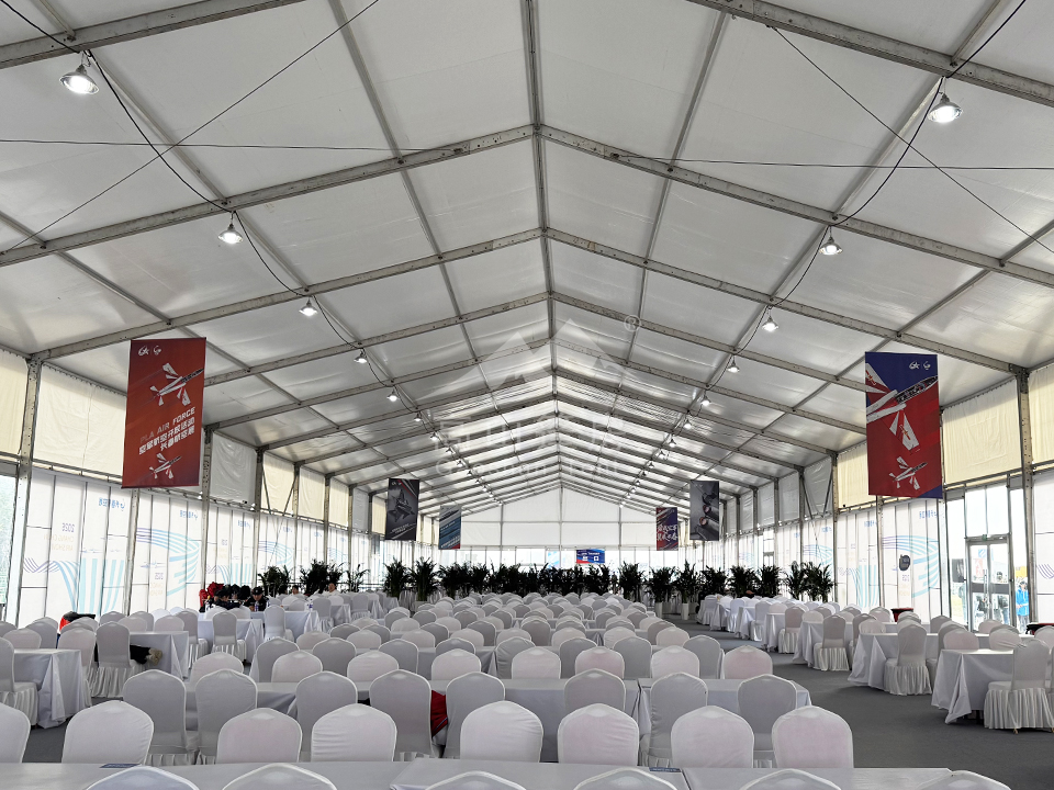 高山篷房憑借高強度鋁合金型材和阻燃雙面PVC篷布,為航展提供抗風、防水、防火、防紫外線的優良性能。