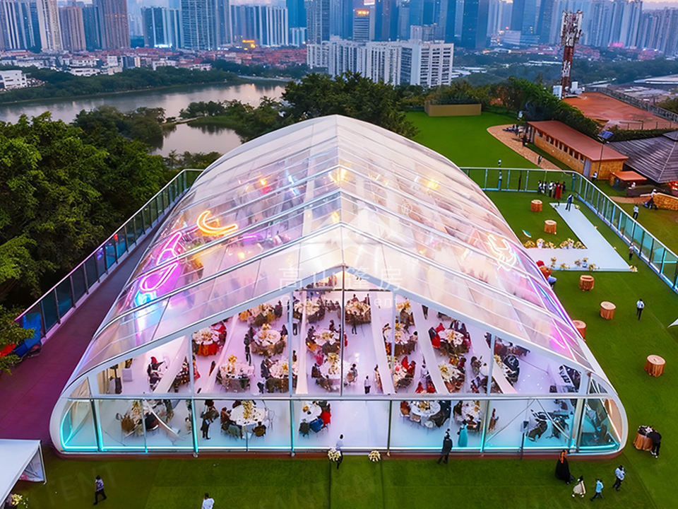 環(huán)境控制:空調(diào)、通風(fēng)系統(tǒng)、保溫墻體,保障內(nèi)部舒適;功能擴(kuò)展:透明PVC窗、玻璃幕墻、木地板、照明設(shè)備;安全防護(hù):防雷、排水槽、加固錨釘,應(yīng)對惡劣天氣。這種靈活性使桃型篷房適配婚禮慶典、展覽展會(huì)、體育賽事、應(yīng)急避難等上百種場景,實(shí)現(xiàn)“一篷多用”。