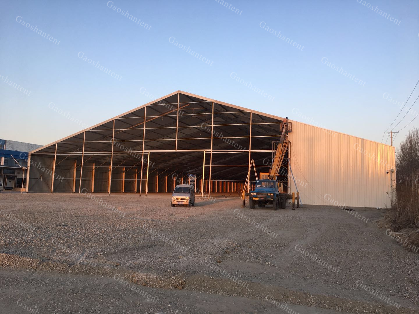 另外,考慮到大型設(shè)備、貨車頻繁進(jìn)出,高山除了利用篷房?jī)?nèi)部無(wú)梁無(wú)柱的空間,特加高了篷房的整體高度,且前后兩端設(shè)計(jì)10米寬的大型車輛進(jìn)出通道,提高工作效率。