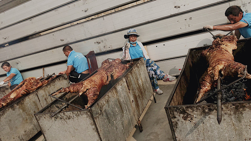 小龍蝦、大飛蟹攜海螺、蜆子等小兵霸氣上桌,狗肉、燒雞、鴨脖等熟食鹵味蓄勢待發(fā),各種涼菜和水果也不甘示弱,這時重量級嘉賓烤全羊閃亮登場,而主角啤酒大哥則言簡意賅:開喝!